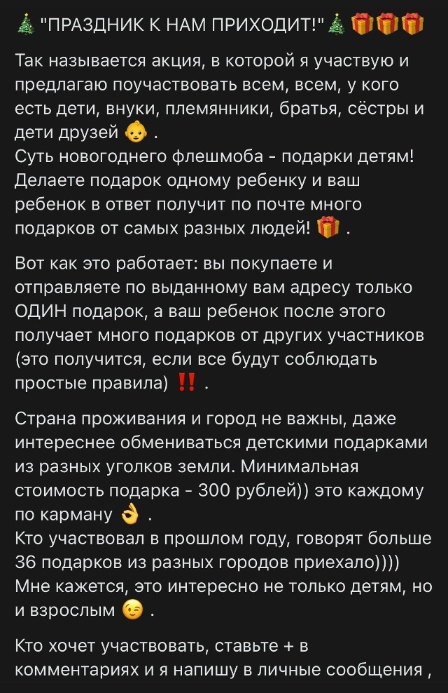 В прошлом году писала одна девочка с подобным призывом в ТГ-группе, так ей вопрос задали "откуда возьмутся 35 подарков дополнительных", а она и не думала об этом. Так же как и не думала о том, что и она может быть тем, кто останется без подарка, так как может дурачков и не найти. При этом у нее сестра, вроде как, за год до этого участвовала в подобном мероприятии и получила нормально подарков, а в этом и она сама решила поучаствовать. А может просто ездила по ушам, пытаясь привлечь кого-то в данный развод.