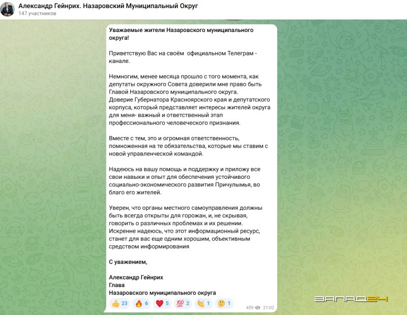 🚀Глава Назаровского округа Александр Гейнрих завел канал в популярном мессенджере Telegram