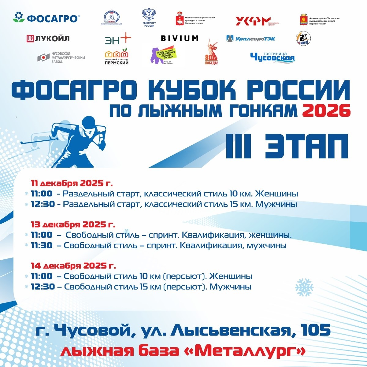 ⚡ 🌟 ☄📅 ФосАгро Кубок России по лыжным гонкам 2025-2026гг. III этап ✨ Программу этапа составят соревнования различного формата: 🗓 11 декабря, четверг 🏂 Раздельный старт, классический стиль: 🕒 11:00 — Женщины, дистанция 10 км 🕒 12:30 — Мужчины, дистанция 15 км 🥈 14:00 — Награждение победителей и призёров 🗓 13 декабря, суббота 🛠 Свободный стиль — спринт: 🕒 11:00 — квалификация женщин 🕒 11:30 — квалификация мужчин 🌐 12:30 — церемония открытия соревнований 🤸♀ 13:00—14:30 — финалы, полуфиналы, четвертьфиналы 🥈 15:30 — награждение победителей и призёров 🗓 14 декабря, воскресенье 🧗 Персьют (гонка преследования), свободный стиль: 🕒 11:00 — Женщины, дистанция 10 км 🕒 12:30 — Мужчины, дистанция 15 км 🥈 14:00 — Награждение победителей и призёров персьюта и общего зачета Мини-тура. 👏🏼 Участникам и зрителям желаем интересных состязаний, увлекательных моментов и незабываемых эмоций! #спорт@glavachus