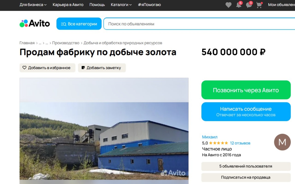 На Авито продают законсервированный золотоносный рудник за 540 миллионов рублей