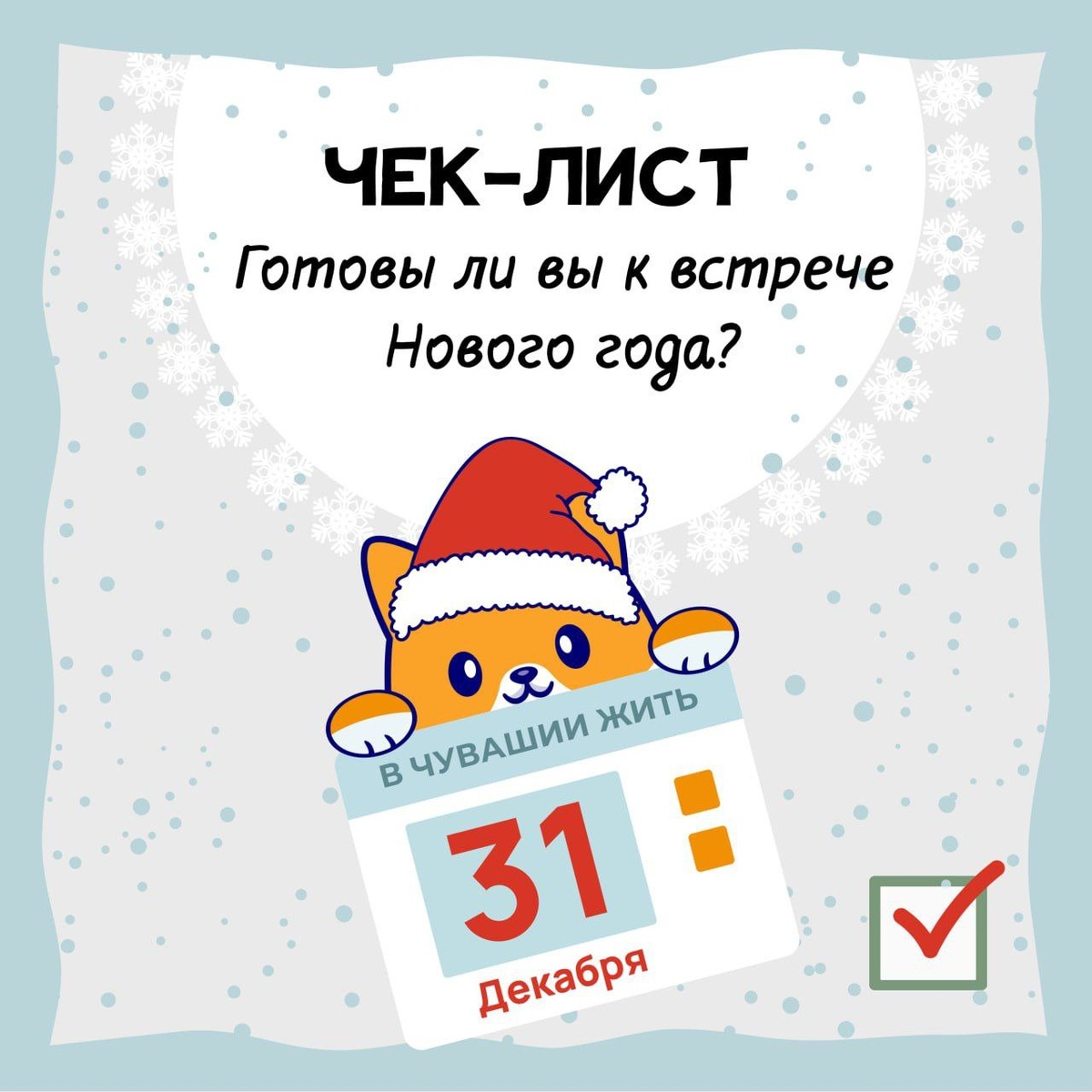 #вчувашиижить – четкие планы строить Встретить день с улыбкой проще, когда всё под контролем. А встретить Новый год тем более! Проверьте, насколько вы готовы к наступающему празднику, с нашим полезным чек-листом. Пробегитесь глазами по списку и ответьте «Да» или «Нет» на каждый пункт. Сколько пунктов у вас уже выполнено? Делитесь своей цифрой в комментариях! ⤵️ Подписаться / Предложить новость