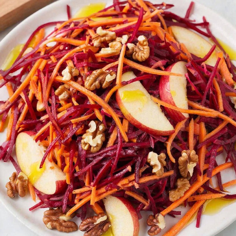 Рецепт полезного свекольного салата с указанием калорийности ▌ Ингредиенты: - Свёкла варёная — 300 г (~82 ккал) - Яблоко зелёное — 1 шт. (~52 ккал) - Морковь варёная — 100 г (~35 ккал) - Орех грецкий — 30 г (~195 ккал) - Лимонный сок — 1 ч.л. (~3 ккал) - Оливковое масло — 1 ст.л. (~120 ккал) - Соль, специи — по вкусу Итого: примерно ~500 ккал на порцию. ▌ Калорийность порции (около 400 г): Примерно 125 ккал на 100 г продукта. ▌ Шаги приготовления: 1. Подготовка овощей - Отварите свёклу и морковь до мягкости. Дайте остыть и очистите овощи. 2. Натирание ингредиентов - Натереть на средней терке варёную свёклу, морковь и яблоко. 3. Добавление орехов - Грецкий орех слегка обжарьте на сухой сковороде и мелко нарубите ножом. 4. Заправка - Перемешайте ингредиенты в глубокой миске, добавьте лимонный сок и оливковое масло. Посолите и поперчите по вкусу. 5. Готово! - Ваш полезный свекольный салат готов к подаче! Такой салат станет отличным дополнением к рациону благодаря содержан