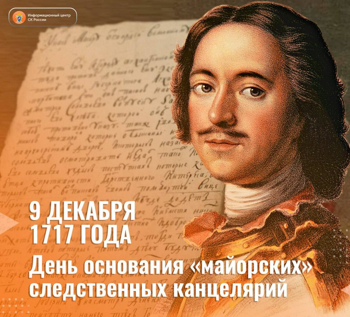 9 декабря – День основания «майорских» следственных канцелярий 9 декабря 1717 года специальным Наказом Петра I была учреждена деятельность «майорских» следственных канцелярий. Эта дата в истории российского следствия считается поистине значимой, поскольку «майорские» канцелярии являются прообразом современного Следственного комитета Российской Федерации. 25 июля 1713 года учреждается первый специализированный следственный орган – следственная канцелярия гвардии майора Михаила Ивановича Волконского. В дальнейшем, в 1714 – 1715 годах Петром I были учреждены еще три следственные канцелярии, а в 1717 году – ещё шесть. Все они, согласно Наказу «майорским» следственным канцеляриям от 9 декабря 1717 года, подчинялись непосредственно Петру I. В их состав входили офицеры Семёновского и Преображенского полков, которые были наделены более широкими процессуальными полномочиями. В Наказе от 9 декабря 1717 года не был упомянут ни один орган власти, управомоченный давать «майорской» канцелярии каки