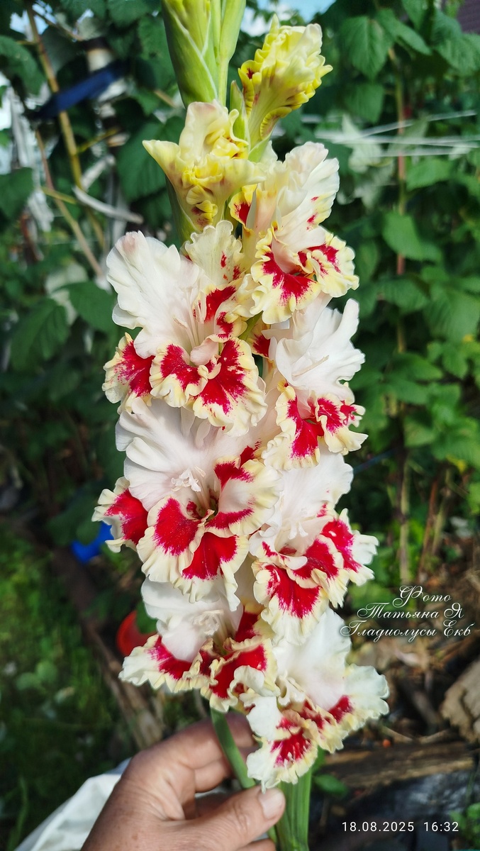 #Гладиолус Ассоль 301-РС-Крашенинников-2008-Г Гладиолус с ярким сочетанием контрастных цветов. Основной тон цветка белый, на трёх нижних лепестках крупные, рубиново-красные пятна в золотой оправе. Хотя шифр у сорта 301, но он хорошо растёт и на 4. Очень стройный стойкий колос. Tatiana ВК