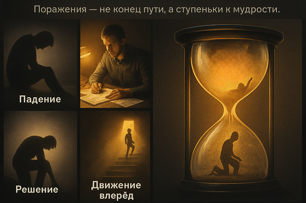 Время — лучший учитель. Оно незаметно, но уверенно подводит нас к одной простой, хоть и не самой очевидной мысли: настоящую мудрость дарят не победы, а поражения. Звучит парадоксально? Давайте разбираться. Почему проигрыши важнее побед? Представьте боксёра, который ни разу не побывал в нокауте. Звучит круто, но на деле — подозрительно. Настоящий боец познаётся не в безоблачных победах, а в том, как он встаёт после падения. Так и в жизни: Поражение — это чек‑лист ошибок. Оно чётко показывает: «Вот здесь ты промахнулся. Вот тут недоработал. А тут вообще пошёл не туда». Проигрыш — тренажёр стрессоустойчивости. После нескольких неудач вы уже не дрожите при мысли о риске, а спокойно анализируете: «Что пошло не так? Как исправить?» Неудача — лакмусовая бумажка окружения. Именно в сложные моменты становится ясно, кто рядом с вами — попутчики или настоящие друзья. Как не позволить поражениям стать правилом? Да, поражения неизбежны. Но важно не дать им превратиться в привычку. Вот несколько ра