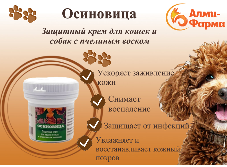 Реагенты влияют на кожу подушечек лап наших собак Противогололедные смеси — это специальные вещества, которыми городские коммунальные службы обрабатывают дороги и тротуары: они расщепляют накатанный снег и лед, препятствуют их повторному образованию. Негативное действие реагентов на собачий организм может выражаться в следующем: Травмы — в основном потертости, ссадины царапины и порезы из-за действия крупных абразивных фрагментов. Химические ожоги — образуются при попадании реагентов на подушечки лап и в полость рта в результате их вылизывания. Кожа при этом становится сухой, раздраженной, трескается, чешется. Слизистая оболочка воспаляется, на ней появляются покраснение, язвы. Аллергические реакции — их могут спровоцировать мельчайшие частицы химических реагентов, попавшие в дыхательные пути. Также противогололедные средства иногда вызывают отравления, если попадают в желудочно-кишечный тракт питомцев. Защитный крем "Осиновица"с пчелиным воском, прополисом и экстрактом осиного гнезда