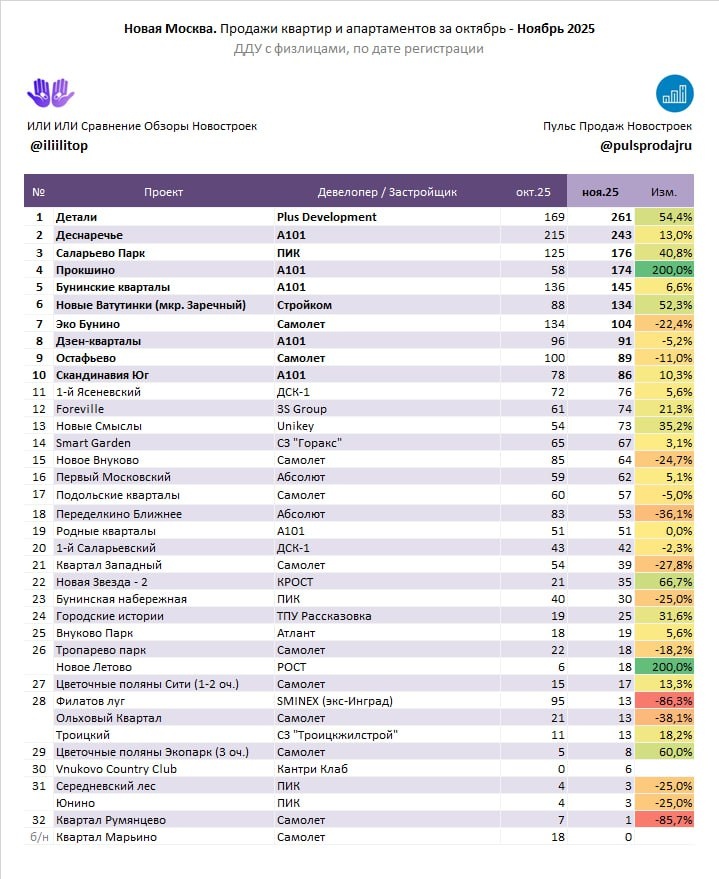 ⚡️Продажи Ноября 2025 в новостройках Новой Москвы ▪️Общая статистика здесь ▪️По проектам: Золото и 261 ДДУ - уходят в жк Детали (Plus Development). Следом идёт Деснаречье (А101) на 243 сделки. На 3-ю строчку поднялся Саларьево Парк (ПИК), зарегистрировав 176 ДДУ. Хотя, можно сказать, что делят место с Прокшино (А101) = 174 ДДУ (+200% м/м) ▪️Топ-3 девелопера по спросу ноября: А101, Самолет и Plus Development. Вместе ребята собрали 61,5% покупателей Новой Москвы... Кому в долях - то округлённо, соответственно: 33... 17... и 11% на брата. ПИК в этот раз вышел из топа, с долей 9% На подходе статистика Подмосковья, СПб и Ленобласти 🔥 @pulsprodaj