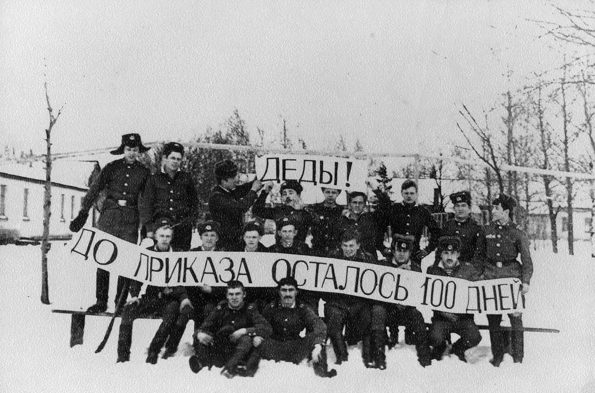 Солдаты позируют с плакатом "Деды! До приказа осталось 100 дней