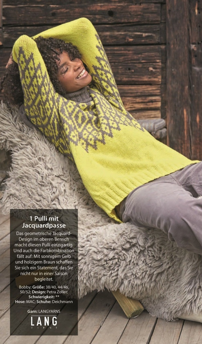 Джемпер BOBBY. • Размер: 38/40 (44/46) 50/52 • Пряжа: LANGYARNS "Lambswool", (шерсть ягненка) (100% натуральная шерсть, 150м/50г) - 300 (350) 400 г желтого (Fb 14) и 250 (300) 350 г серого (Fb 96). • спицы № 3,5 и 4,5 • круговые спицы № 3,5. Схема узора Выкройка Джемпер BABETT • Размер: 36/38 (40/42) 44/46 • Пряжа: LANGYARNS , "Malou light" (72% альпака, 16% полиамид, 12% натуральная шерсть, 190м/50 г) - 350 (400) 450 г серо-коричневой (Fb 196). • спицы Clover № 4 и 5 • круговые спицы Clover № 4. Схема узора Выкройка Джемпер BONDY • Размер: 38 - 42 (44 - 48) • Пряжа: Зимняя шерсть "ЛАНА ГРОССА" (50% натуральной шерсти, 35% хлопка, 15% яка, 70м/50г) - 600 (650) г темно-коричневого цвета (Fb20). • спицы ЛАНА-ГРОССА № 5,5 и 6,5 • круговые спицы ЛАНА-ГРОССА № 5,5. Схема узора Выкройка Джемпер BUDDIE • Размер: 36/38 (40/42) 44/46 • Пряжа: ЛАНА ГРОССА, "Brigitte № 2" (47% альпака, 45% хлопок, 8% натуральная шерсть, 140м/50г) - 250 (300) 300 г серо-коричневой (Fb 60) и "Mo