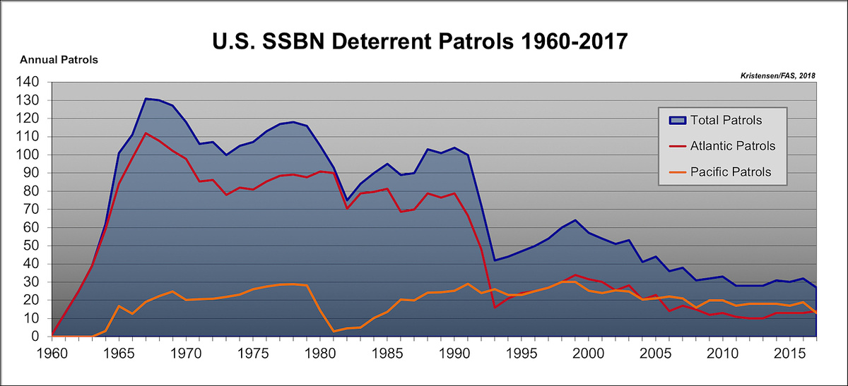 Тем не менее, данные показывают, что в 2017 году флот американских ПЛАРБ провел в общей сложности 27 патрулирований (на пять меньше, чем в 2016 году), что является самым низким показателем за один год с начала 1960-х годов, когда ПЛАРБ начали проводить патрулирование с целью устрашения. Тем не менее, колебания невелики: современные ПЛАРБ проводят патрулирование дольше, чем ПЛАРБ 1960-х годов, а общее количество патрулирований оставалось относительно стабильным на протяжении последнего десятилетия.