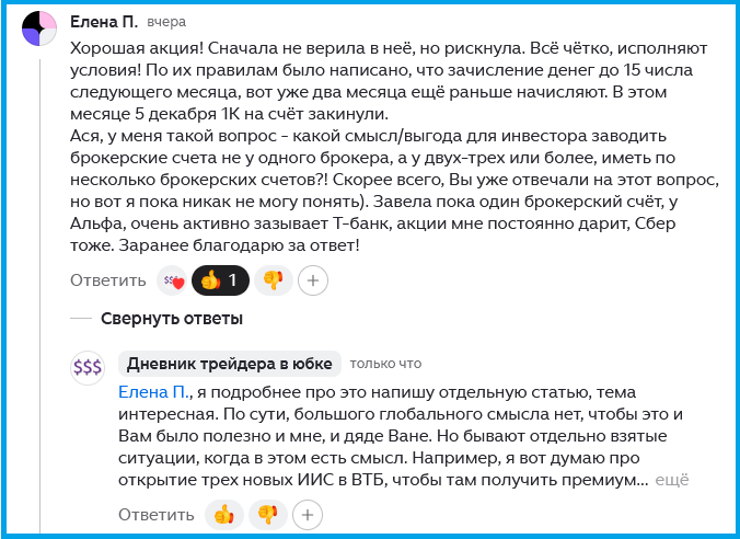 И я сейчас решила, что на отдельном брокерском счете буду собирать бонусы полученные от Альфы. Я занимаюсь этим уже около месяца, чуть позже расскажу об этом в отдельной статье, когда уже хоть какая-то суммы накапает. И вот на удивление, за последние несколько лет я открыла несколько счетов ради бонуса, а в итоге они трансформировались и стали для меня полезны в другом. Но не все. Вот, например, я открыла 2 счета ради кредитной карусели. Эти счета я пока только для нее и использую. А другого глубокого смысла в них пока нет. Но в то же время мне скоро выводить деньги с брокерского счета, я понимаю, что БКС это не понравится, меня могут заблокировать. И по этому поводу я уже думаю о том, а не стоит ли на него купить акций, чтобы они там всегда лежали. Вот так и рождаются у меня мысли о новом счете.