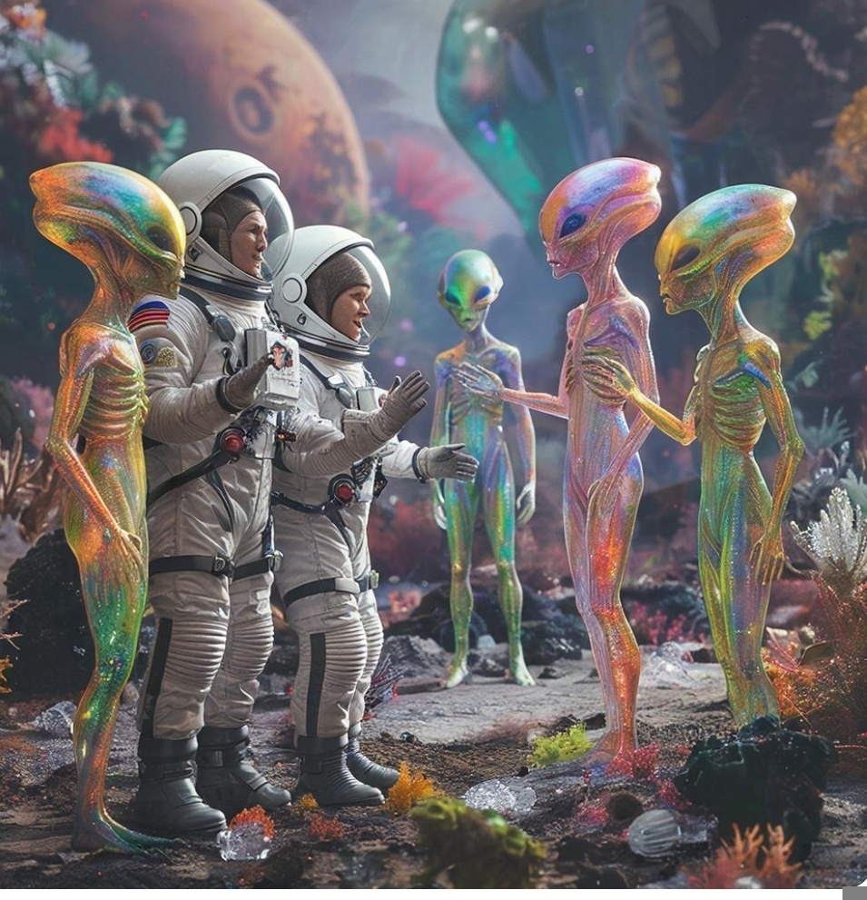 Первая встреча с куруэнцами произошла у края их города, похожего на гигантский коралловый риф, переливающийся всеми цветами радуги. Существа были высокими, тонкими, с кожей, меняющей оттенок в зависимости, как мы позже поняли, от их мыслительного процесса.
