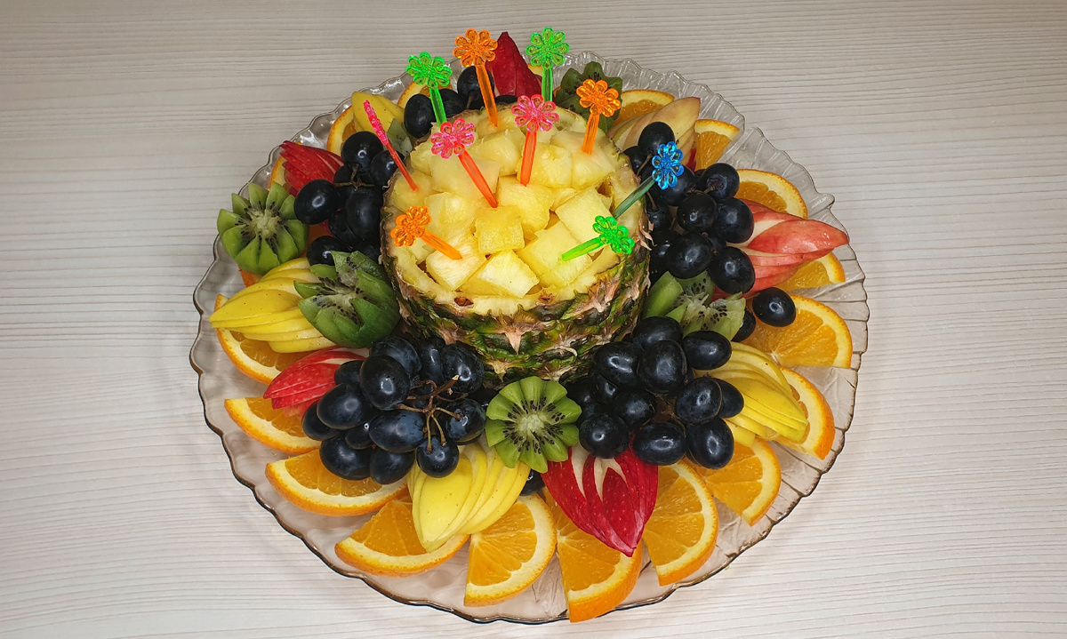 Всем привет! Скоро Новый год, и, наверное, уже все начинают задумываться о меню. Поэтому сегодня хочу рассказать, как сделать фруктовую нарезку яркой и эффектной из самого базового минимума ингредиентов. Забудьте о скучных тарелках с нарезанными фруктами — сегодня покажу, как сделать настоящий шедевр, который станет звездой вашего праздничного стола! Сохраняйте, скоро пригодится👌 Нам понадобится: 1 свежий ананас 2 апельсина 3 яблока (лучше разных цветов для контраста) 3 киви 1 гроздь винограда (любого цвета или микс) Приступаем к нарезке: Аккуратно отрезаем верхушку ананаса и ровное донышко. Тонким ножом вырезаем сердцевину ананаса, стараясь не повредить стенки. Затем аккуратно вытаскиваем мякоть из "чаши". Мякоть ананаса нарезаем на небольшие аккуратные кубики. По центру большого блюда кладем сначала донышко от ананаса. Сверху на него устанавливаем "чашу из стенок" ананаса. Апельсины тщательно моем и нарезаем тонкими полукруглыми ломтиками. Аккуратно раскладываем ломтики апельси