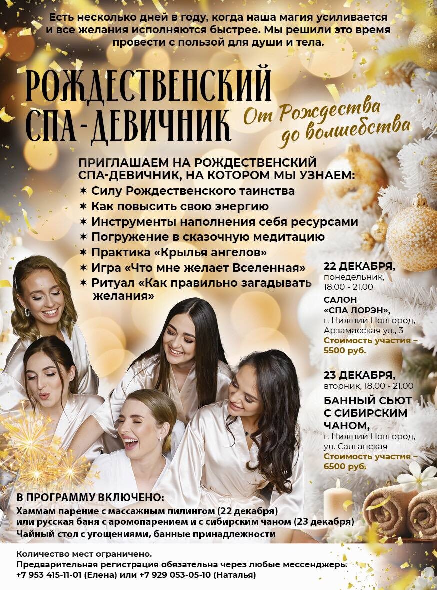 «От Рождества до Рождества. От Волшебства до Волшебства». 🎊 ➡Есть несколько дней в году, когда наша магия усиливается и все желания исполняются быстрее. Мы решили это время провести с пользой для души и тела. Приглашаем на Рождественский СПА-девичник, на котором мы узнаем: ⤵ ✅- Силу Рождественского таинства ✅- Как повысить свою энергию ✅- Инструменты наполнения себя ресурсами ✅- Погружение в сказочную медитацию ✅- Ритуал «Как правильно загадывать желания» ✅- Практика «Крылья ангелов» ✅- Игра «Что мне желает Вселенная» ➡В программу включено: ✅- Хаммам парение с массажным пилингом ✅- Чайный стол с угощениями ✅- Банные принадлежности 📌22 декабря, понедельник, 18.00 - 21.00 📍 Салон «Спа Лорэн», г. Нижний Новгород, Арзамасская ул., 3 ‼Количество мест ограничено. ➡Предварительная регистрация обязательна. Кому забронировать - пишите⤵️ @elenaandrukhina
