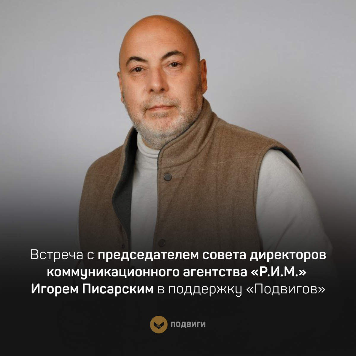 Приз – встреча с Игорем Писарским, основателем агентства «Р.И.М.». За 34 года в пиаре он провёл более 700 федеральных кампаний. А ещё Игорь – профессор, автор книг и председатель совета премии «Серебряный Лучник». С победителем он готов обсудить: 👉 как устроен рынок коммуникаций сегодня и куда он движется 👉 как отличить хороший PR от плохого 👉 как строится репутация и сильный бренд 👉 какими навыками должен обладать топовый специалист 👉 зачем бизнесу стратегические коммуникации Участвуйте в аукционе в поддержку медиапроекта «Подвиги» и выигрывайте полезную встречу! 👉🏻 https://clck.ru/3QjKMS ❤️Ещё больше вдохновляющих новостей – в телеграм-канале «Подвиги обычных людей» https://t.me/podvigi