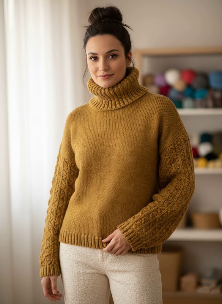 Сегодня рассмотрим стильную модель, которая идеально подходит для прохладного сезона — свитер оверсайз с высоким воротом PULL WEEKEND от дизайнеров Giuliano & Giusy Marelli. Эта модель сочетает в себе простой крой и эффектную текстуру рукавов, что делает её отличным проектом даже для опытных новичков. Свитер выполнен в свободном крое (оверсайз), имеет высокий, плотно прилегающий ворот и рукава с изящным ажурным узором. Эту модель я нашла на простарах Pinterest`а, а нейронка любезно помогла перевести и сгенерировать фото готового изделия. Узор на рукавах, правда, не тот, но выглядит тоже интересно. Информация о проекте Вязание этого свитера по сложности оценивается как "Легкое". Размер готового изделия: 44 (Итальянский). Пряжа: Cashmongolia от Miss Tricot Filati. Расход: 700 г (2 цвета: 500 г основного + 200 г контрастного, хотя по описанию может подразумеваться просто 700 г в 2 нити). Спицы: №6. Дополнительные материалы: Игла без острия. Узоры, используемые в работе В этом проект