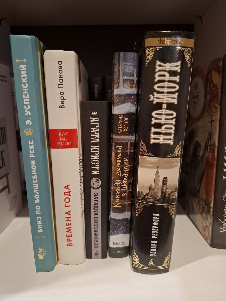 В ноябре я подыскивала себе парочку книг с новогодним настроением, но по сути купила только одну такую. Это книга "Книжная деревушка в Шотландии". Я уже начала ее читать, и не только по первым главам, уже по аннотации понятно, что это довольно предсказуемый роман. Но хочется верить, что он создаст праздничное настроение, ведь все составляющие есть - рождественская пора, снежная зима, уютная небольшая деревня. Не жду от этой книги многого, но пока читается с интересом. Роман Веры Пановой "Времена года" я выбрала по двум причинам. Во-первых, мне очень понравились ее "Спутники". Во-вторых, привлекла обложка. Хочется почитать что-то про советский Новый год, но все же я понимаю, что праздничного настроения мне эта книга точно не создаст: у героев полно проблем, и не факт, что все закончится хэппи-эндом. "Загадки Ситтафорда" Агаты Кристи я выбрала из-за сюжета, действие которого происходит зимой. Да еще и в ограниченном пространстве, да и еще маленькая уютная деревенька. Все, как я люб