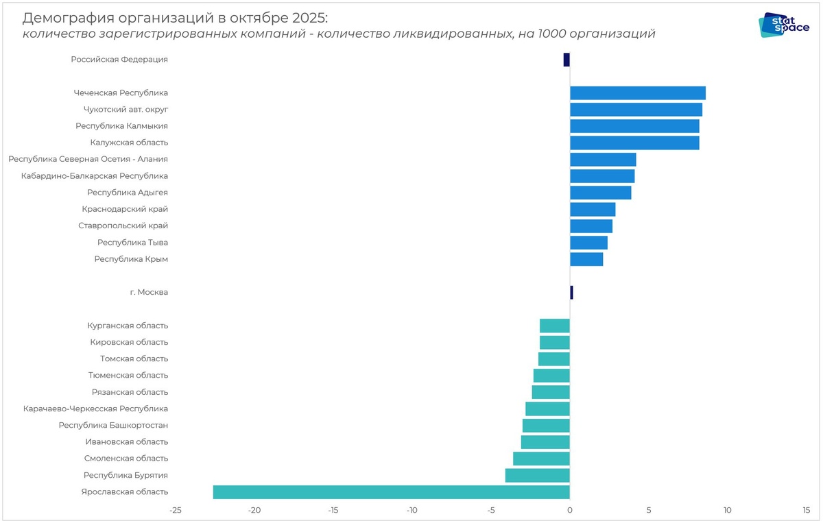 Демография организаций в октябре 2025 В октябре этого года в России было зарегистрировано 16244 компании, а ликвидировано - 17412, в пересчёте на тысячу действующих компаний получаем -0.4 организации (на 1000) за месяц. При этом в антилидере - Ярославской области - за октябрь 2025 число компаний уменьшилось на 22.6 на тысячу (-2.26% от общего числа организаций всего за месяц!). В других регионах-лидерах по снижению числа компаний падение заметно скромнее: -4.1 на тысячу в Бурятии, -3.6 - в Смоленской области, -3.1 - в Ивановской, -3 - в Башкортостане. В лидерах по увеличению числа компаний - Чечня (+8.6 на тысячу), Чукотка (+8.4) и Калмыкия с Калужской областью (по +8.2)