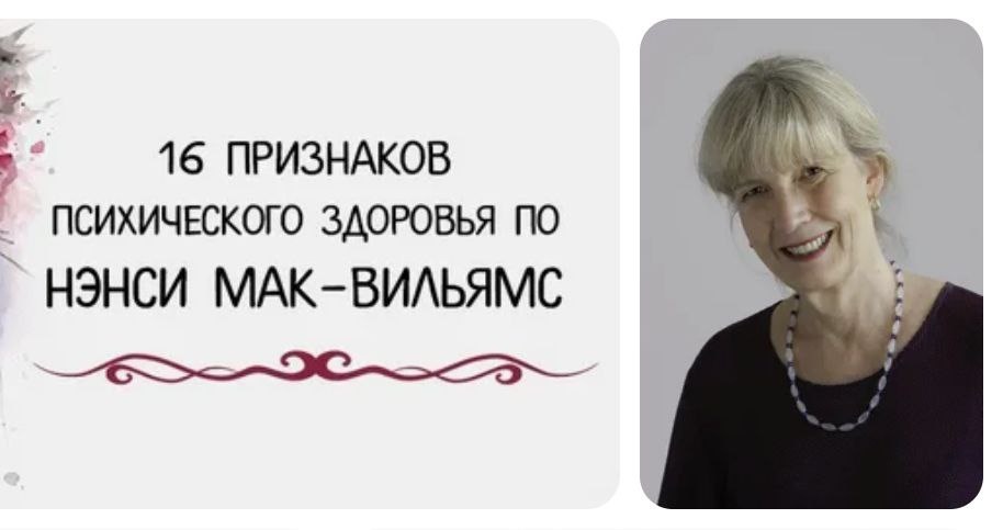 16 элементов психического и эмоционального здоровья. Нэнси Мак-Вильямс (Nancy McWilliams) - классик современного психоанализа, автор учебника по психоаналитической диагностике, предлагает критерии для определения психического благополучия. Фрейд считал основными признаками психического здоровья (и основными целями психоанализа) способность любить и способность работать. Нэнси Мак-Вильямс добавляет: и способность играть. Вообще-то она называет 16 признаков душевного здоровья. Но эти три включают в себя большую часть остальных - чтобы человек мог любить, работать и играть, получая удовольствие от этих занятий, он так или иначе должен обладать и остальными признаками. А теперь все 16 признаков по-порядку: ⭐️Способность любить другого человека, не идеализируя его. Осознавать его недостатки и достоинства. ⭐️Способность работать и получать удовлетворение от работы. Способность найти дело по душе, создавать интеллектуальный или материальный продукт и ощущать от этого удовлетворение. ⭐️