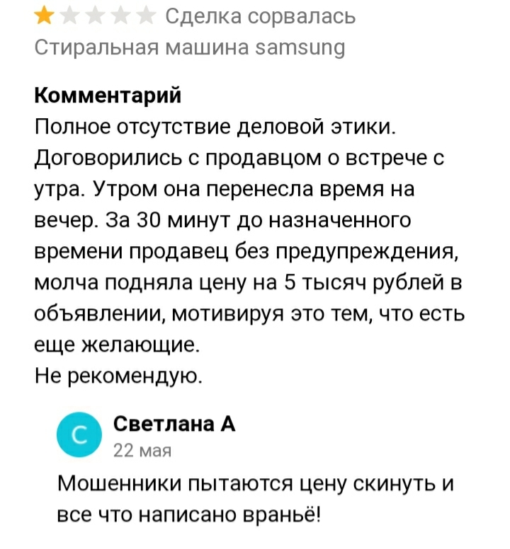- «Сделки не было, переписка отсутствует. Отзыв нарушает правила».