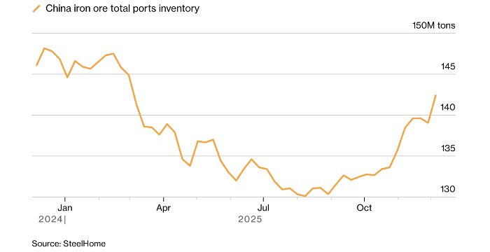 Цены на железную руду упали до самого низкого уровня за месяц, продолжая снижение в преддверии ключевого политического саммита китайских властей на этой неделе. Он должен прояснить политические приоритеты на следующий год Запасы железной руды в Китае растут. Источник: Bloomberg Фьючерсы на основной компонент для производства стали в Сингапуре дешевеют третью сессию подряд, приближаясь к психологически важной отметке в $100 за тонну. Ожидается, что в ближайшие дни в Китае пройдет Центральная экономическая рабочая конференция, которая последует за заседанием Политбюро Коммунистической партии. На этом заседании укрепление внутреннего спроса было названо главным экономическим приоритетом на 2026 год. Затянувшийся спад в секторе недвижимости Китая оказал давление на спрос на сталь, однако импорт железной руды в страну в этом году был высоким, достигнув рекорда за 11 месяцев к концу ноября. Запасы в крупных китайских портах сейчас выше среднего сезонного уровня, хотя и ниже, чем в 2024 году.