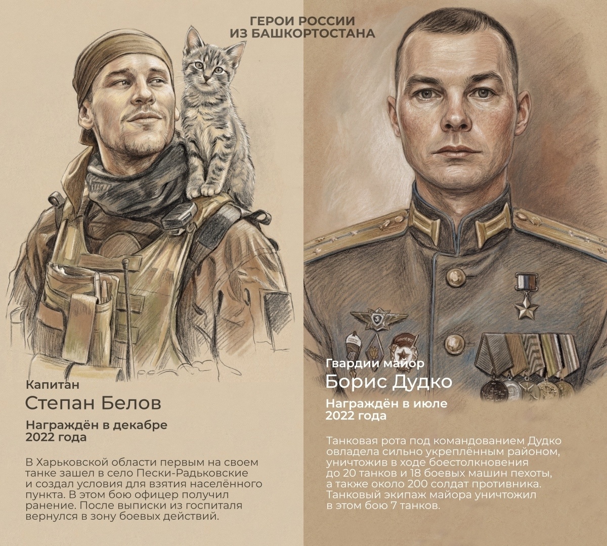14 Героев России из республики обессмертили свои имена воинскими подвигами, став примером мужества и героизма. Глава республики Радий Хабиров на своей странице в соцсети рассказал о 14 Героя России, уроженцах Республики Башкортостан. На карточках представлены выполненные художниками портреты Героев и рассказ о подвигах наших земляков. Публикация была приурочена к Дню Героев Отечества. В своем посте Радий хабиров отметил, что Башкортостан — земля героев. Здесь живут и трудятся люди с сильным духом, готовые самоотверженно защищать свою Родину от врагов, порой жертвуя собственной жизнью. Так было всегда, и так продолжается сегодня. Глава региона написал, что в День Героев Отечества мы с благодарностью вспоминаем подвиги наших земляков — Героев России, которые проявили мужество и отвагу в ходе специальной военной операции. Низкий поклон каждому из них. Фото со страницы в соцсети Радия Хабирова.