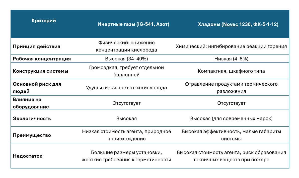 Решили защитить серверную или архив газовой системой? Ключевой вопрос — тип огнетушащего вещества. Газовое пожаротушение выбирают для защиты объектов, где недопустимо применение воды или пены: серверные, архивы, музеи. После этого решения встает следующий вопрос: какой тип огнетушащего вещества предпочесть? Разберем два основных класса агентов. Принципиальная разница в механизме тушения Инертные газы: Действуют по принципу разбавления атмосферы. Они снижают концентрацию кислорода в воздухе помещения с 21% до 12-15%, что делает горение невозможным. Хладоны: Действуют как химические ингибиторы. Они активно вмешиваются в цепную реакцию горения на молекулярном уровне, подавляя пламя. Это фундаментальное отличие определяет все дальнейшие эксплуатационные и экономические характеристики систем. Сравнение по ключевым параметрам 1. Эффективность и требуемая концентрация Главный показатель — объемная концентрация вещества, необходимая для ликвидации пожара. Инертные газы: Требуют высокой концен