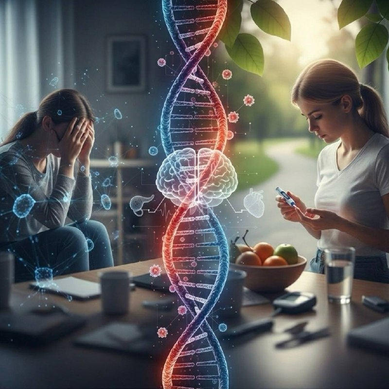 Депрессия и сахарный диабет. Кто в зоне риска? Вы, наверное, слышали, что СД2 часто связан с образом жизни — питанием, весом, движением. При этом он довольно часто сочетается с депрессией. Новое крупное генетическое исследование проливает свет на эту тему Дело не только в образе жизни. Долгое время считалось, что депрессивное состояние при СД2 это именно реакция на диагноз, а СД2 при депрессии — следствие малоподвижного образа жизни и гормональных сбоев из-за лекарств. Однако исследование (GWAS и МРТ-анализ) выявил чёткую генетическую корреляцию между большим депрессивным расстройством (БДР) и СД2. Это значит, что существует общий набор генов, которые делают человека уязвимым сразу к обеим патологиям. Анализ с помощью метода Менделевской рандомизации (MR) показал, что фенотипы депрессии (то есть сам факт наличия или предрасположенности к депрессии) причинно влияют на риск развития СД2 через эти общие генетические вариации. Исследователи предполагают, что ключевую роль в этой генет
