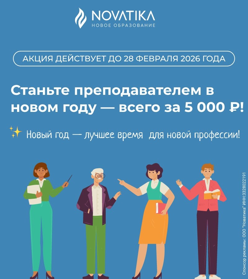 🎄Станьте преподавателем в новом году — всего за 5 000 ₽! Акция действует до 28 февраля 2026 года Учебный центр «Новатика» запускает специальный набор для тех, кто хочет начать преподавать, делиться знаниями и выйти на стабильный дополнительный или основной доход в 2026 году. ✨ Новый год — лучшее время для новой профессии! В декабре мы открыли набор на обучение преподавателей по символической цене — 5 000 ₽ вместо полной стоимости диплома ПП. Почему стоит воспользоваться акцией прямо сейчас? — начнёте 2026 год с новой востребованной профессией; — зафиксируете минимальную стоимость обучения; — сможете выйти на перспективную подработку или постоянную занятость уже в январе–феврале; — получите шанс стать частью команды «Новатики». Мы даём возможности тем, кто хочет развиваться — и помогать другим учиться. 📩 Оставляйте заявку на сайте — мы свяжемся с вами и ответим на все вопросы. ⏳ Время акции ограничено!