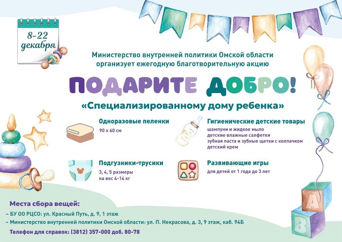 Министерство внутренней политики Омской области приглашает принять участие в традиционной благотворительной акции «Подарите добро!» Продолжается сбор вещей для подопечных «Специализированного дома ребёнка», в котором воспитываются дети до 4 лет, нуждающиеся в постоянном уходе. С 8 по 22 декабря 2025 года каждый желающий может принять участие и проявить заботу о детях, которые с рождения лишены родительской любви и внимания. Для маленьких воспитанников требуются следующие предметы: 🔸 Подгузники-трусики (размеры 3, 4, 5, вес 4-14 кг); 🔸 Средства для ухода и гигиены (шампунь, детский крем, детские влажные салфетки, мыло, зубная паста, зубные щетки с колпачком); 🔸Одноразовые пеленки; 🔸Развивающие игры для детей от 1 года до 3 лет. 📍Места сбора вещей: 🤩РЦСО: ул. Красный Путь, д. 9, 1 этаж; 🤩Министерство внутренней политики Омской области: ул. Л. Некрасова, 3, 9 этаж, каб. 94Б. 🤩Телефон для справок: 8 (3812) 357-000 доп. 80-78. Присоединяйтесь к акции и подарите добро тем, кто о