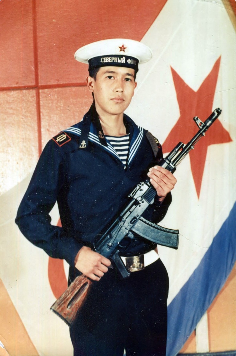 Матрос береговых частей Северного флота на фоне флага ВМФ с автоматом. Матрос во фланелевой форменной рубахе с нашивными погончиками с красным кантом. Источник: отсканированная фотография из личной коллекции. #фото #ВМФ #Северный_флот #СФ