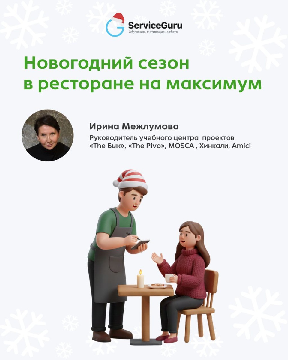 Новогодний сезон — проверка команды и сервиса на прочность ⚡️ Высокий поток гостей, банкеты, предельная нагрузка на команду и работа на максимум. ❗️В этот период особенно важно заранее подключить управленческие инструменты, которые помогут снизить напряжение внутри команды, выстроить чёткие процессы и повысить средний чек. Тогда даже при высокой загрузке праздничный сезон пройдёт спокойно, без сбоев и форс-мажоров. Ирина Межлумова, руководитель учебного центра проектов «The Бык», «The Pivo», MOSCA, «Хинкали», Amici, рассказала, что поможет сохранить команду и сервис в новогодний сезон. Читайте в карточках 👆