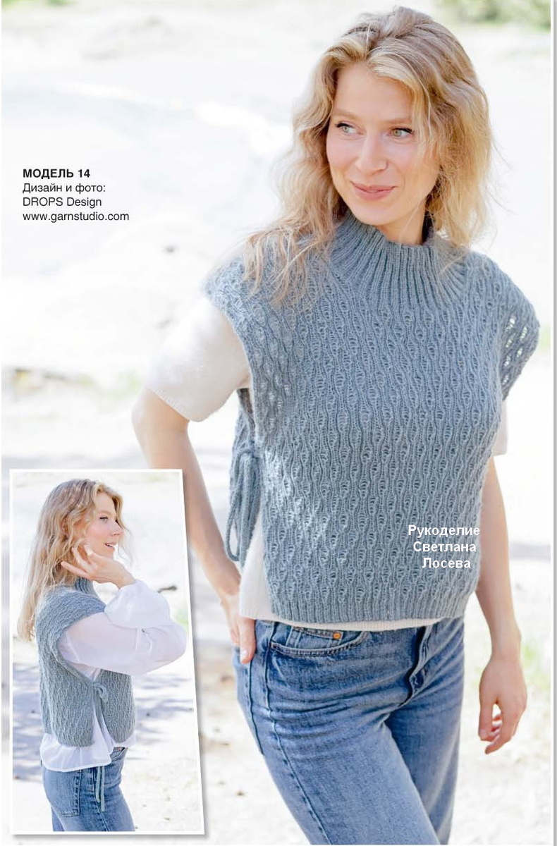 - Практичность. Жилет не сковывает движений, подходит для разных сезонов (в зависимости от плотности вязки) и легко трансформирует образ.