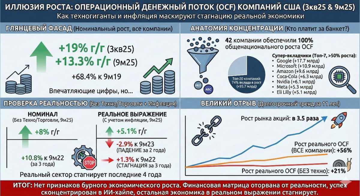 #аналитика 🇺🇸 Операционный денежный Поток американских компаний, по итогам третьего квартала, показывает приличный прирост. Казалось бы, все отлично. Но, на самом деле, ситуация удручающая - рост показателей происходит только в ИИ-секторе и технологических компаниях. Все остальные компании США стагнируют. Ссылка на исходник