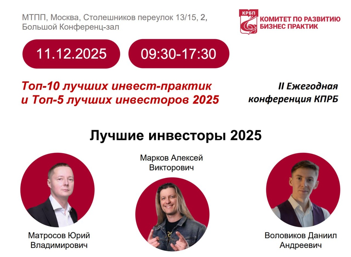 #мероприятие Друзья и коллеги! Уже скоро, а именно 👉11.12.2025 в 09:30 - 17:30 по МСК состоится: II ЕЖЕГОДНАЯ КОНФЕРЕНЦИЯ КРБП РЕЙТИНГ ЛУЧШИЕ ИНВЕСТОРЫ И ЛУЧШИЕ ИНВЕСТИЦИОННЫЕ ПРАКТИКИ 2025 👉СВОБОДНЫЙ ВХОД👈 🔻Место проведения:🔻 ул. Петровка, д.15, стр.1, 2 этаж, Большой конференц-зал 👉РЕГИСТРАЦИЯ НА МЕРОПРИЯТИЕ👈 Что вас ждет: История: Комитет МТПП по развитию бизнес-практик уже второй год подряд определяет лучших экспертов с интересными практиками, технологиями, методами, проектами, которые реализованы для заказчиков. В 2024 году были запущены Рейтинг Лучшие инвесторы и Лучшие инвестиционные практики, и мы награждали опытных инвесторов разного масштаба вложений и в различные сферы бизнес и социальных проектов, развивающих МСБ и направления крупного бизнеса в России и дружественных странах, также замечательные инвестиционные проекты в различных сферах бизнеса, с привлечением различных инвестиционных продуктов. Цель: транслировать лучшие инвестиционные практики, лучший о