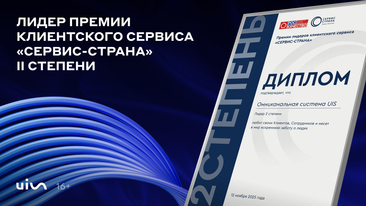 В ноябре 2025 года в рамках национальной премии «Сервис-страна», поддерживаемой Советом Федерации и проходящей при участии экспертов Роскачества, UIS получил статус «Лидер II степени». UIS — ведущая российская омниканальная система для эффективного управления коммуникациями с клиентом в маркетинге и продажах. Мы помогаем отслеживать и управлять путем клиента на каждом этапе воронки продаж за счет объединения аналитики рекламы, IP-телефонии, обработки голосовых и текстовых коммуникаций с клиентами в единый контур. Эта премия для UIS — подтверждение высокого уровня технической поддержки и клиентского сервиса, который мы предоставляем с 1999 года. Благодарим экспертов за высокую оценку! Прочитать официальный пресс-релиз на сайте→