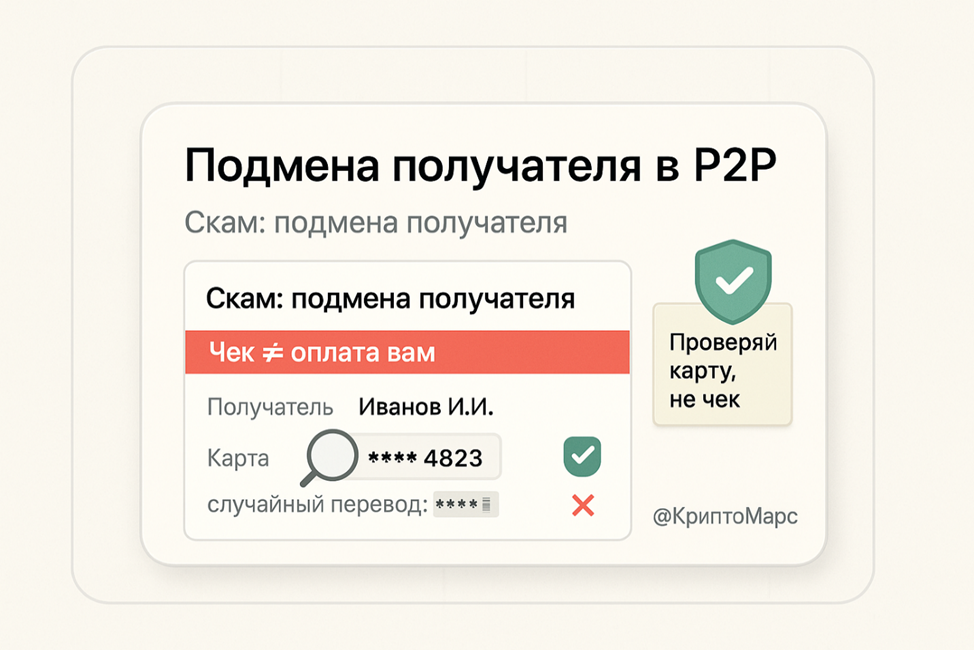 P2P-рынок развивается, и вместе с этим появляются новые способы обмана. Но важно понимать: проблема не в самом P2P, а в том, что злоумышленники постоянно ищут, где можно сыграть на невнимательности трейдера. Сегодня разберём свежий сценарий подмены получателя в банковском приложении и покажем, как защититься без паники и лишних страхов. Как работает схема Шаги мошенника выглядят просто — и именно из-за этой простоты схема обманчива. Заходит в сделку как покупатель. Получает ваши реквизиты, всё выглядит стандартно. Делает перевод… но себе: вводит свой счёт или карту, а ваши данные указывает только в назначении платежа. Деньги уходят ему, а визуально чек имитирует правильный перевод. Присылает чек: платёж реально существует, только получателем являетесь не вы. Давит на скорость: рассчитывает, что вы увидите ФИО или номер в назначении платежа и автоматически отпустите крипту. Почему это работает Схема не сложная. Она опирается на: автоматизм при подтверждении сделок доверие к официальным