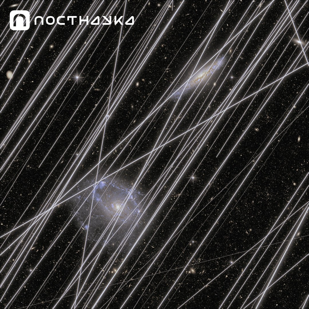 Международный астрономический союз регулярно поднимает вопрос о том, что спутники, например, Starlink, создают помехи для астрономических наблюдений. Проблема заметна уже сейчас, а в будущем может стать ещё острее. На изображении — смоделированная картина предполагаемого загрязнения спутниками, рассчитанная для одного из будущих космических телескопов. Световые полосы отражаются от телекоммуникационных спутников, перекрывают изображение двух взаимодействующих галактик на заднем плане и могут помешать потенциальным научным открытиям. Какие решения есть у этой проблемы? Объясняет астрофизик Сергей Попов: http://youtu.be/uo8iANaGdo4 Источник: NASA / Borlaff, Marcum, Howell