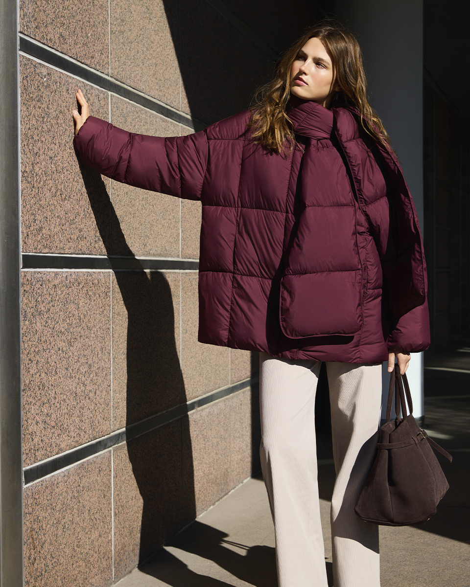 Продолжаем вдохновляться винными оттенками и красиво утепляться. Собрали элегантный образ для холодных дней: мягкий стёганый пуховик с шарфом, кожаные ботильоны с тиснением под крокодила и замшевая сумка. В качестве завершающих акцентов для настроения: массивное кольцо и серьги с эффектом мятого металла.