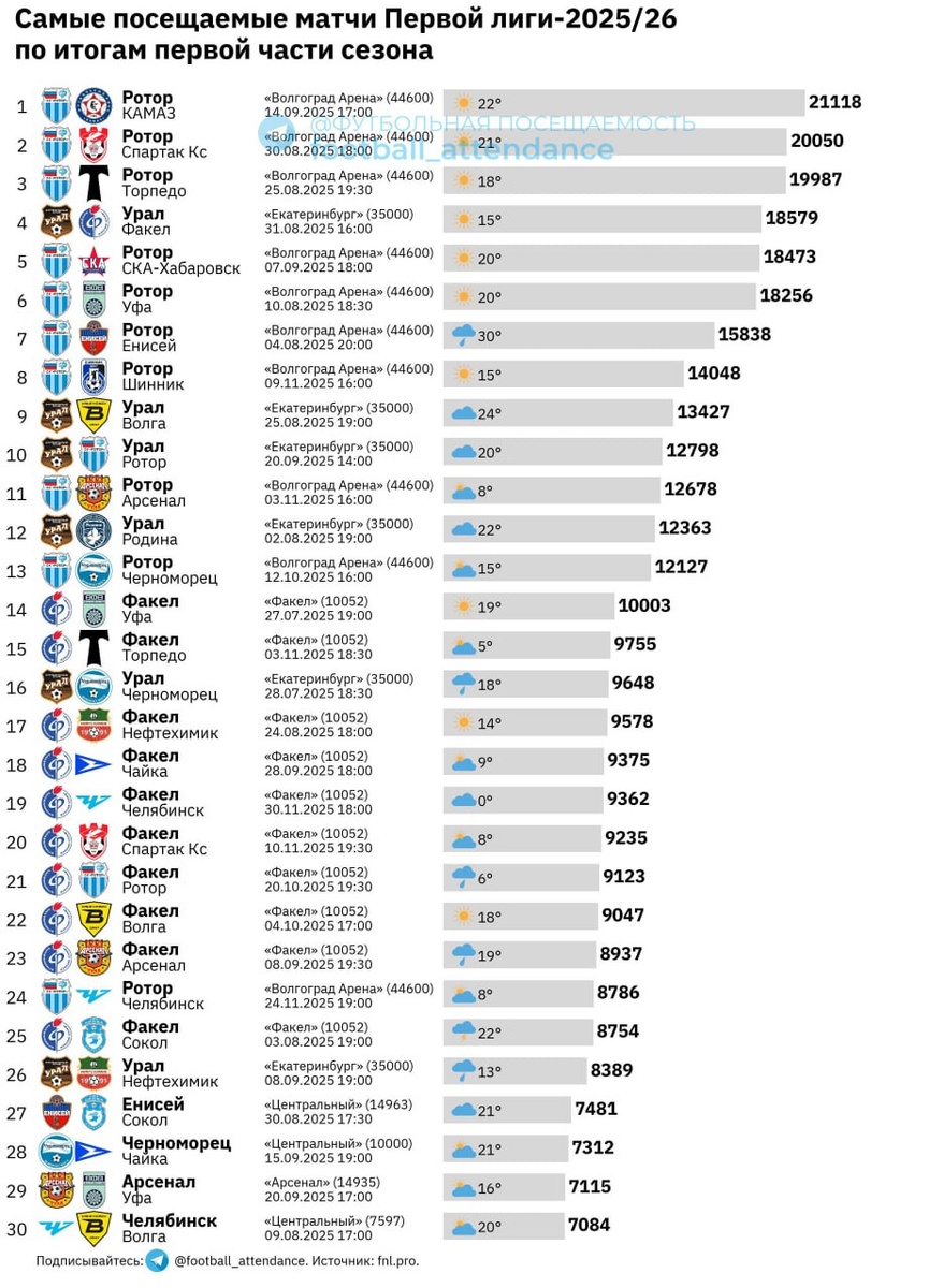 Наибольшая аудитория в завершившейся первой части сезона Первой Лиги собралась в Волгограде 14 сентября — 21118 зрителей на матче «Ротор» — «КАМАЗ». • Также более двадцати тысяч человек пришли ещё на одну «домашку» «Ротора» против костромского «Спартака» (20050). • Пятнадцать и более тысяч человек было на семи матчах, более десяти тысяч — на четырнадцати. • В топ-30 попали десять домашних встреч «Ротора» в этом сезоне. Из этих десяти — семь в топ-10. • Помимо «Ротора» в рейтинге топ-30 попали домашние встречи ещё шести клубов: «Факела» (10 матчей), «Урала» (6), «Енисея» (1), «Черноморца» (1), «Арсенала» (1) и «Челябинска» (1).