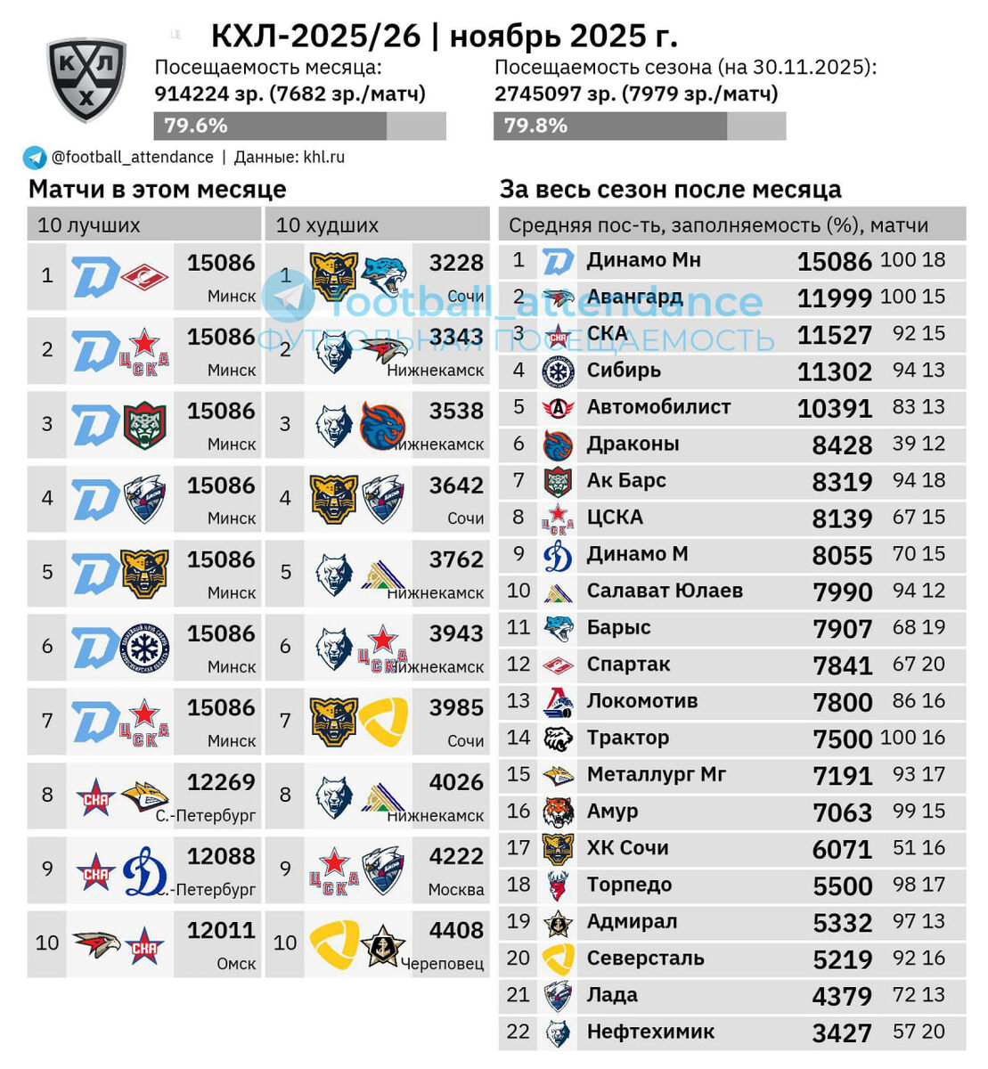 Аудитория лиги в ноябре (7682 зр./матч) была на 4% ниже средней посещаемости в сезоне (7979). • Таким образом, средняя аудитория сезона с октября (8143) снизилась на 2%. • Лидером по аудитории домашних матчей с большим запасом по-прежнему остаётся минское «Динамо»: 7 аншлагов в ноябре и уже 18 во всём сезоне. • В топ-10 по матчам в октябре также две встречи СКА в Санкт-Петербурге и одна — «Авангарда» в Омске. В этом картинка с октябрём полностью совпала. • За ноябрь изменений в топ-5 по средней домашней посещаемости не произошло — все клубы по-прежнему собирают 10 и более тысяч зрителей в среднем на каждой встрече. Наибольший прогресс зафиксирован у «Драконов», которые вернулись на 6-ю строчку таблицы домашней посещаемости, откуда упали на 11-е место по итогам октября. • Наибольший регресс у «Барыса»: опустились с 7-е на 11-е место. • В аутсайдерах по средней аудитории домашних матчей по-прежнему клубы из Нижнекамска и Тольятти. • Средняя заполняемость арен как в ноябре, так и во всём