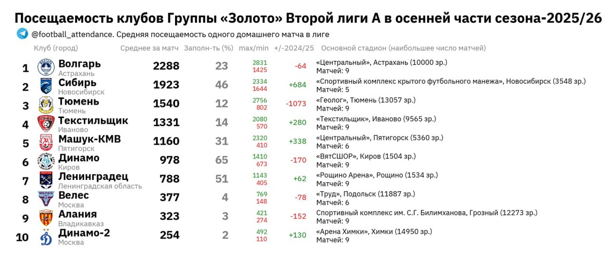 Рейтинг посещаемости клубов группы «Золото» Второй лиги А в осенней части сезона-2025/26