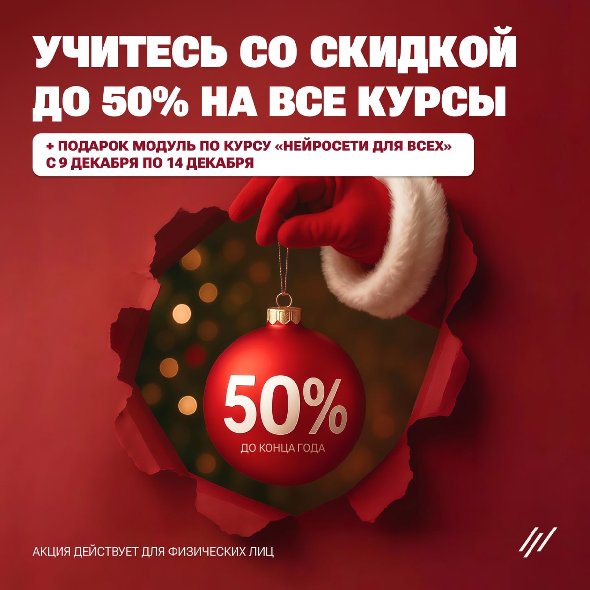 🎄Конец года — отличная возможность обновить карьеру и выйти на новый уровень! ❄️Декабрь — не только время подвести итоги, но и для вложений в собственное развитие. Для компаний действует акция: успейте обучить команду на самых выгодных условиях до конца года! ⭐️Давно задумывались о смене профессии, хотите освоить новые компетенции? Сейчас самое подходящее время! ✅До 31 декабря для физических лиц действует скидка до 50% на все программы обучения. ✅ С 9 по 14 декабря при покупке любого курса вы получите бесплатный модуль «Нейросети для всех» в подарок. 💚Успейте выбрать подходящий курс, зафиксировать цену по акции и получить дополнительный бонус👉 https://clck.ru/3QjzVv ⭐️Для компаний, стремящихся к росту вместе с командой! Улучшайте профессиональные навыки сотрудников и оптимизируйте расходы на обучение до конца года! ✅ Специальная акция для юридических лиц: при покупке двух любых курсов — третий предоставляется бесплатно! ✨ Используйте шанс комплексно прокачать команду в смежных о