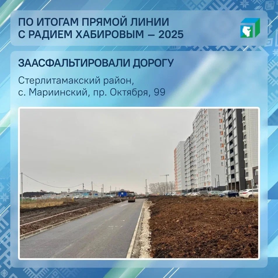 😀😃😄😁 В с. Мариинский Стерлитамакского района заасфальтировали дорогу на пр. Октября, 99. О неудовлетворительном состоянии дороги местные жители написали в обращении на Прямую линию с Радием Хабировым в ноябре 2025 года. Администрация Стерлитамакского района взяла обращение в работу, вышла на связь с застройщиком жилого комплекса. 2 декабря застройщик в рамках плановой работы завершил асфальтирование дороги. После обращения на Прямую линию с Главой республики привели в порядок и дорогу по ул. Мира в с. Большеустьикинское Мечетлинского района. Участок от домов № 9 до 27 отсыпали. 💚 ЦУР Башкортостана