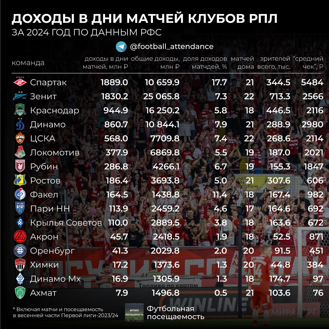 Продолжаю изучение экономического аспекта посещаемости. В частности, мне было интересно найти документы, которые показывали бы доход от билетной программы клубов для понимания и ответов на вопросы, касательно зрительского интереса и конечного результата работы клубов с болельщиками в виде прибыли. И, исходя из обзора на самые дорогие билеты, найти какие-то корреляции. В чистом виде такие данных я нигде не нашёл. Однако наткнулся на любопытный отчёт от РФС о ключевых финансовых показателях клубов за 2024 год. Опубликован он был в конце мая этого года, поэтому более свежей информации на эту тему нет. Впрочем, раскладка по доходам, приведённая в этом документе даёт некоторое представление. В частности, там есть графа «Доходы в дни матчей». Понятно, что в неё помимо реализации билетов входит большое количество статей доходов: обслуживание в ложах, мерч, кейтеринг и т.д. Однако с этим всем и есть прямая связь посещаемости. Данные от РФС (первые три столбца на инфографике) я обогатил информ