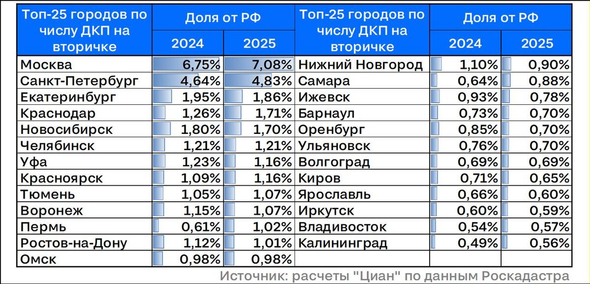 В 2025 году около 34% сделок с готовыми квартирами пришлось на 25 городов из ~1100. Топ локаций почти полностью повторяет рейтинг по численности населения. Но есть исключения: Челябинск, Пермь и Омск — здесь на всех желающих обновить жилищные условия банально не хватает новостроек. Тюмень и Калининград — фактическое население заметно выше официальной статистики, что подогревает спрос.