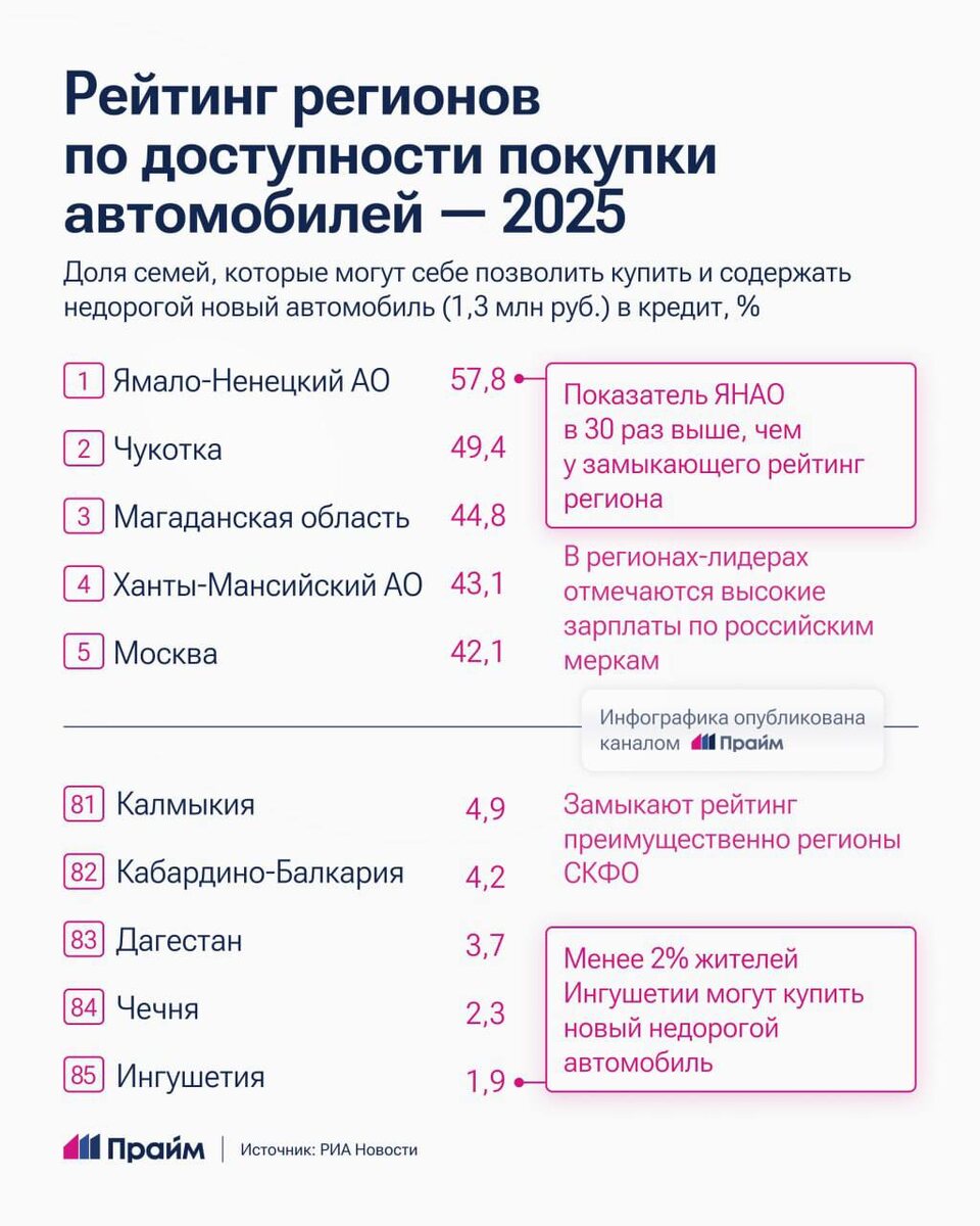 Югра вошла в топ-4 регионов страны по доступности покупки и обслуживания авто. 43,1% семей могут позволить себе новую машину стоимостью в среднем 1,3 миллиона рублей, сообщают аналитики. Но более дорогое новое авто за 2,9 миллиона рублей в ХМАО себе могут позволить купить лишь 16,4% семей. 📷ТГ/ Прайм Подписаться | Прислать новость | Дать «буст» | Мы в MAX