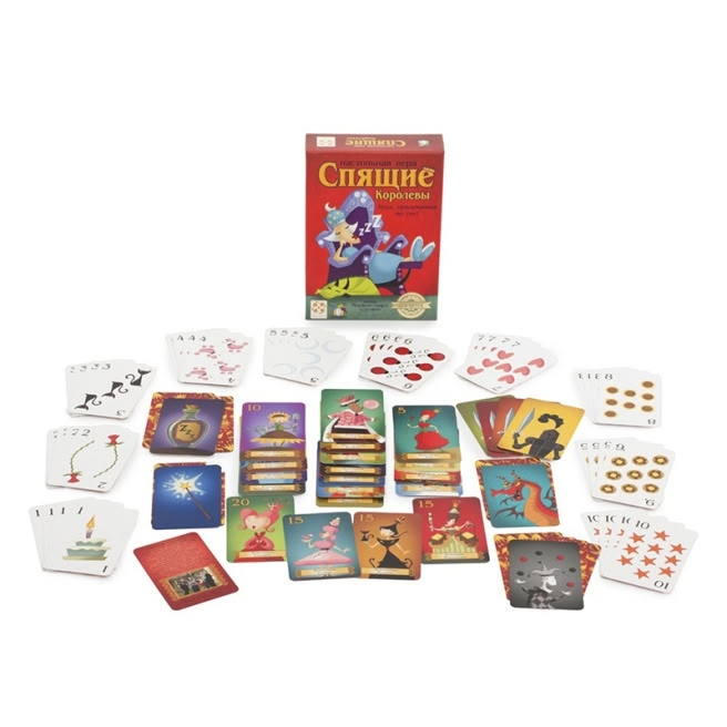 Игра, по сути, на угадайку и везение. У нас есть базовая стопка карт и двенадцать карт королев, которые раскладываются равномерно на столе в закрытую. В основной колоде замешаны несколько королей, которые могут разбудить этих королев, карты, позволяющие украсть или усыпить чужих королев, карты противодействия этим манёврам, а также куча обычных карт с цифрами, нужных лишь для того, чтобы карты с картинками попадались вам реже и рандомнее. У детей с помощью карт цифр можно также потренировать наблюдательность в обмене карт на руке.