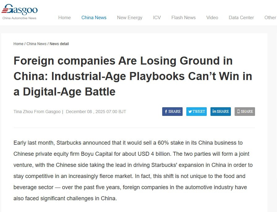 Китайское издание Gasgoo выпустило накануне то, что в прежние времена называли "передовицей". Большую программную статью с заголовком "Иностранные компании теряют позиции в Китае: стратегии индустриальной эпохи не могут победить в битве цифровой эпохи". Прочитали и пересказываем. За последние пять лет структурные изменения в китайском автопроме застали врасплох весь мировой автомобильный сектор. Практически все иностранные бренды столкнулись с крупнейшим в истории "замедлением" в Китае. Рыночная доля СП сократилась с абсолютного доминирования примерно до 30%. Японские автопроизводители отстали на рынке NEV, а культовые модели, такие как CR-V и Camry, утратили свой статус. Немецкие и американские автопроизводители явно отстают в плане интеллектуальных функций, а серия ID даже вышла на поколение позже. В то же время корейские и французские бренды практически не представлены в Китае. Конкурировать удается только Tesla. Тем временем китайские бренды растут поразительными темпами. Их дол