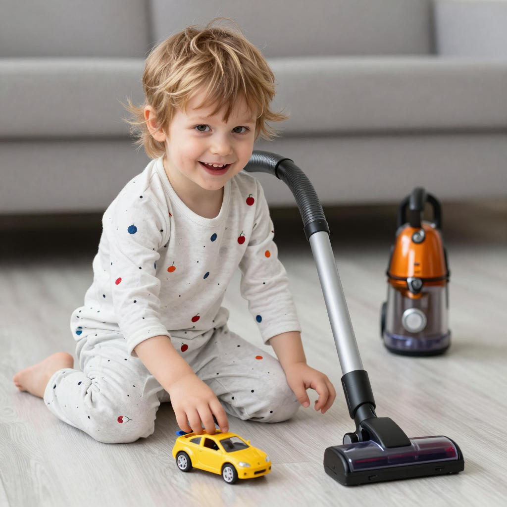 Волосы — как будто его только что вытащили из воронки пылесоса. Играет на полу.